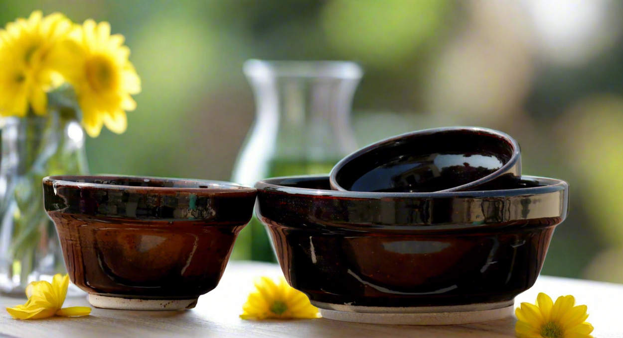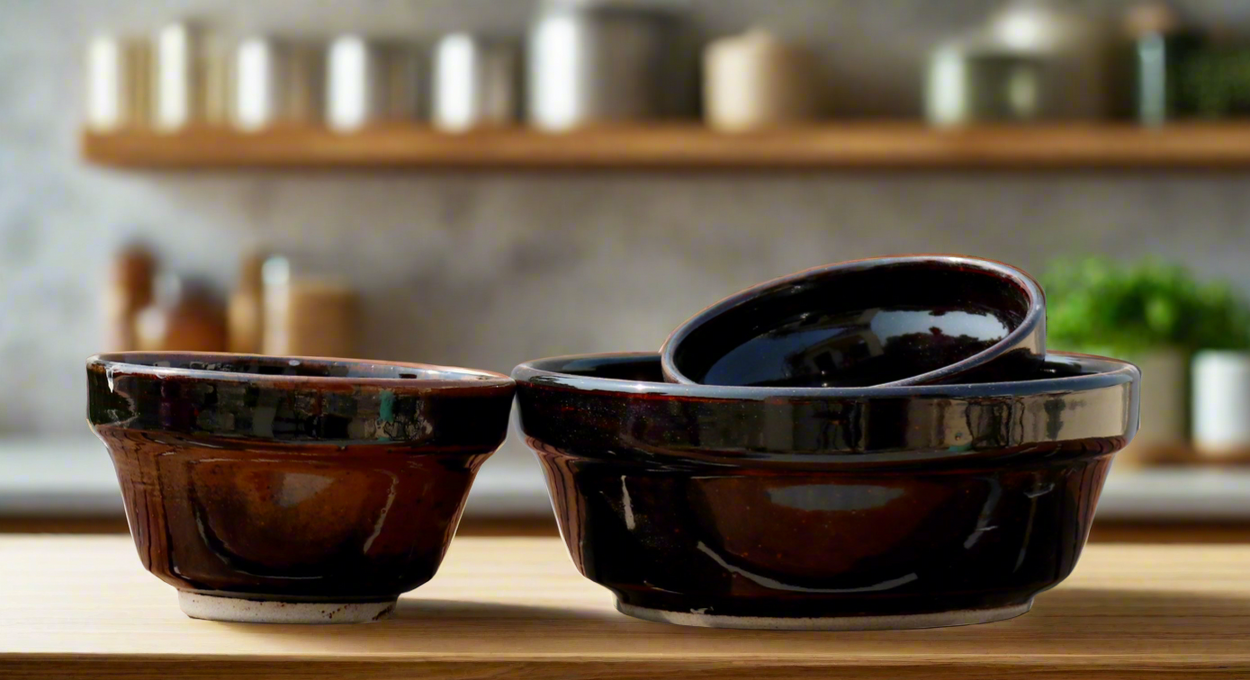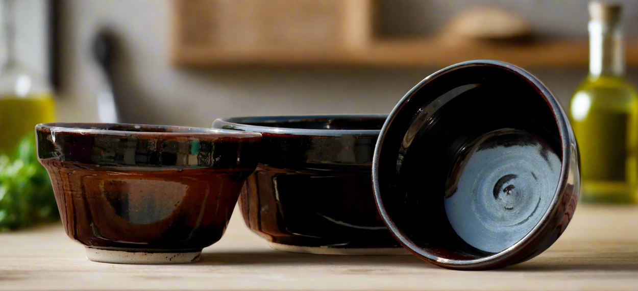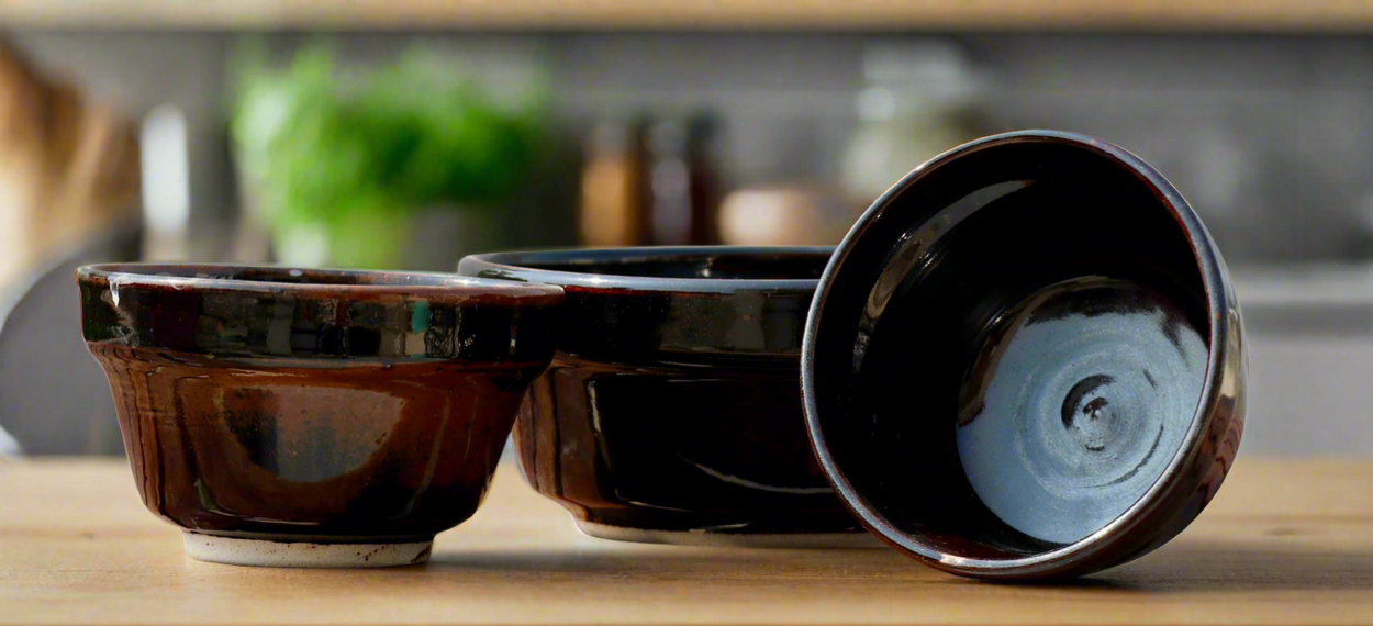 Set of three bowls in stoneware clay - handmade on a wheel and fired in a gas kiln at 1260 degrees celsius. The big bowl can hold upto a litre and the other two bowls can hold about 200 ML. Microwave safe. Since each work is handmade and built on pottery wheel, the sizes and shapes might vary slightly but that is the uniqueness of the product.