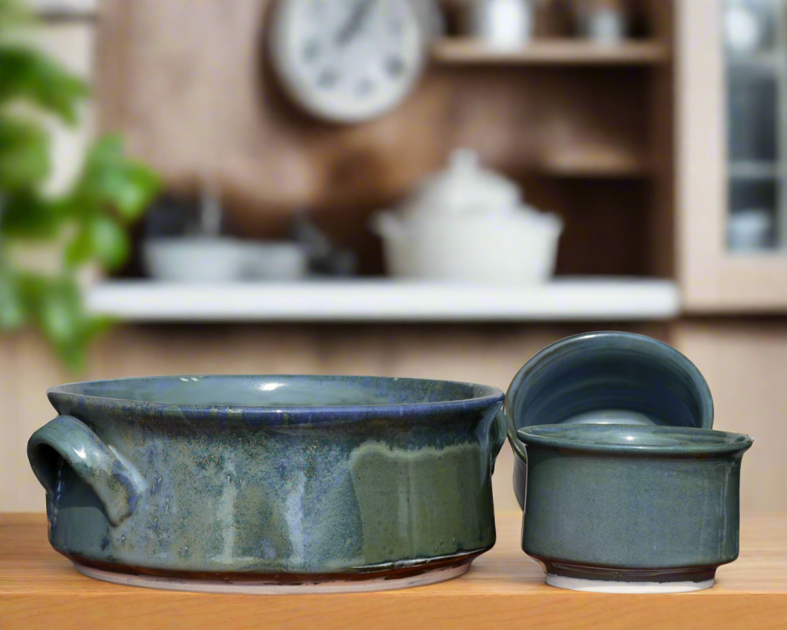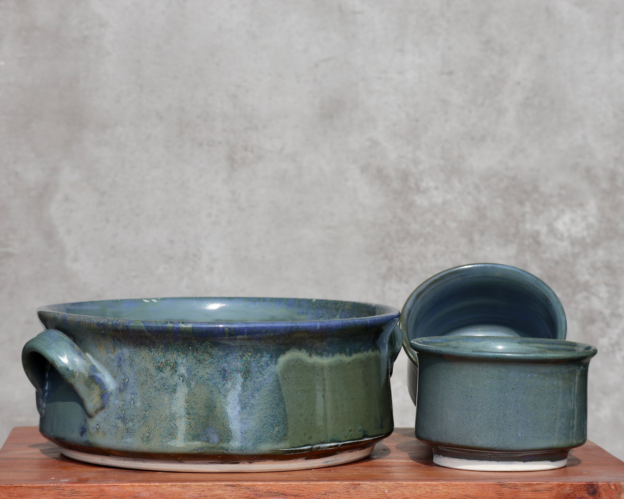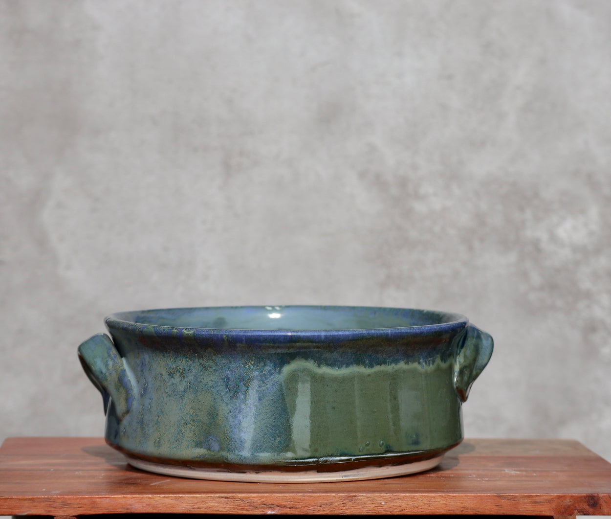 The casserole is handmade on a pottery wheel in stoneware clay and fired in a gas kiln, it is ideal for serving big dishes and can hold upto 1 litre. Though the size is too big for a kitchen microwave but it is safe for the appliance.