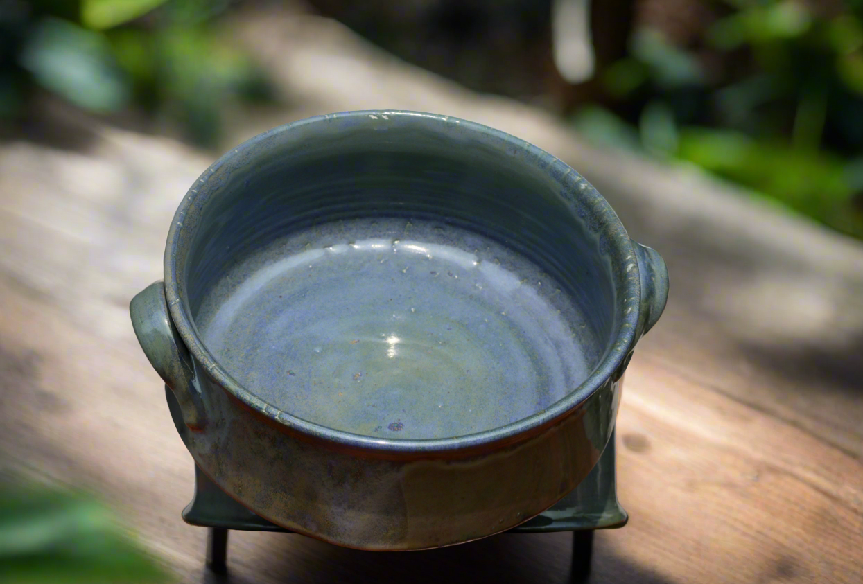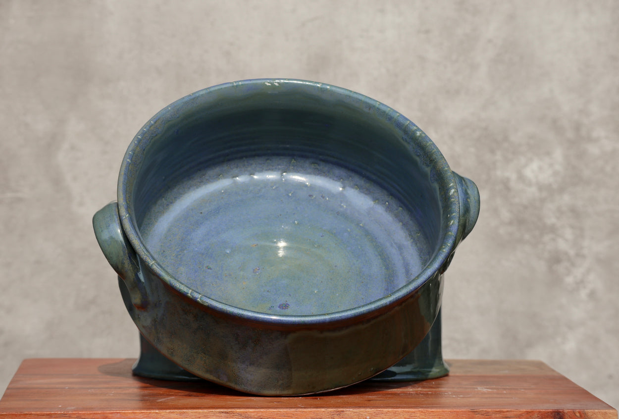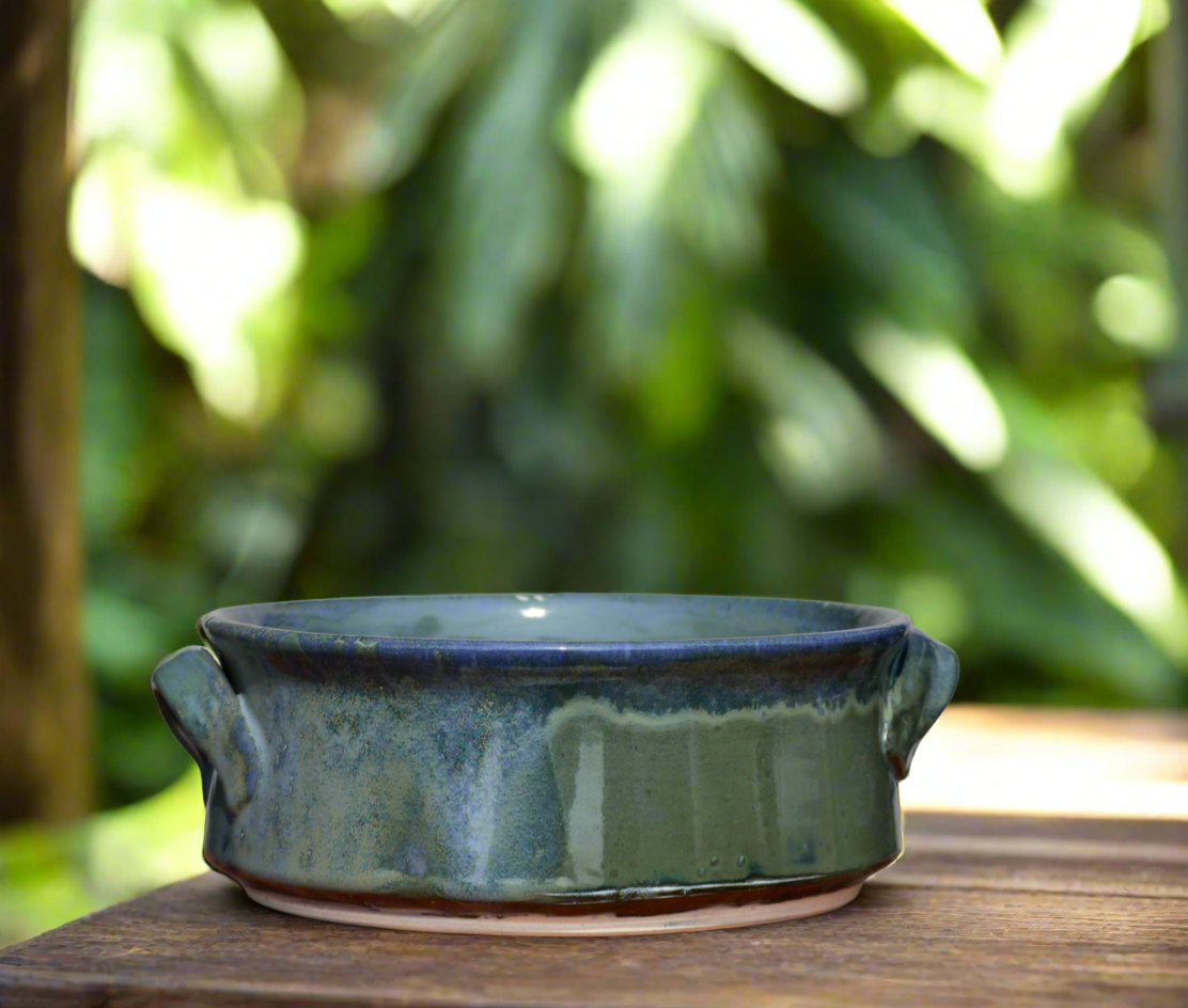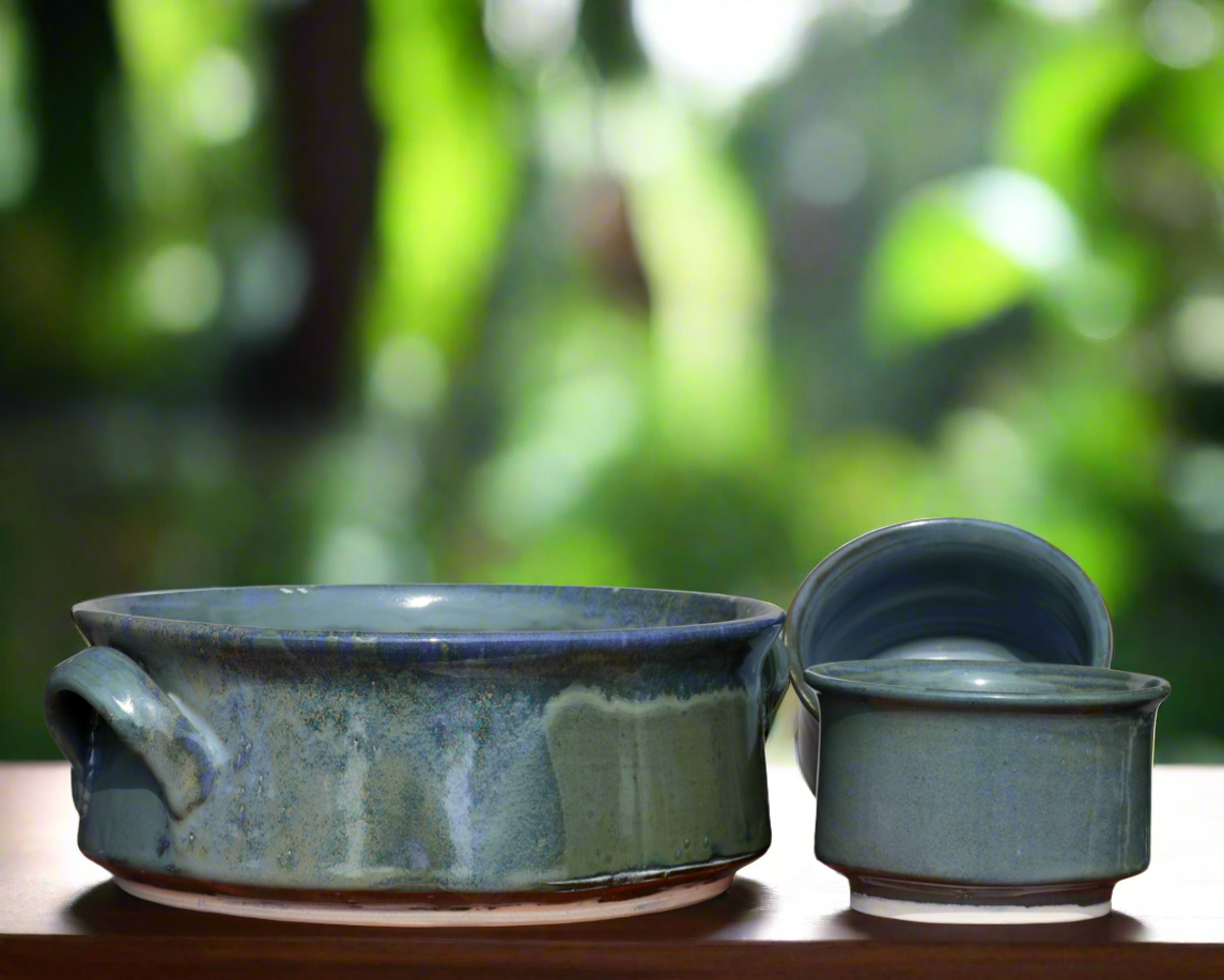 The casserole is handmade on a pottery wheel in stoneware clay and fired in a gas kiln, it is ideal for serving big dishes and can hold upto 1 litre. Though the size is too big for a kitchen microwave but it is safe for the appliance.