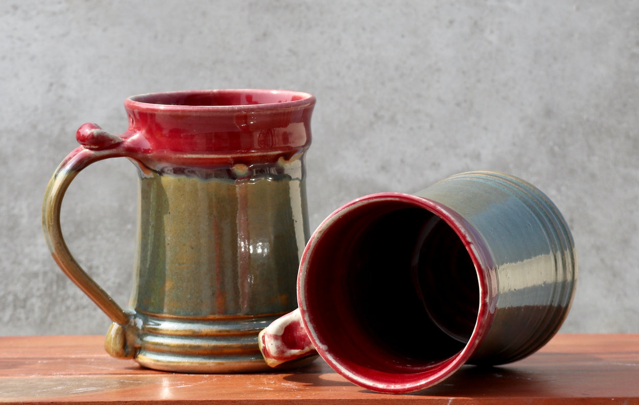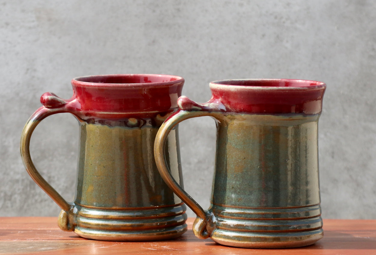 A pair of hand-thrown stoneware mugs can carry about 300 ML coffee or tea. The transparent glaze is unique because of uneven hues of green and red which were achieved during firing in a gas kiln. Since each work is handmade there will be a slight difference in the size and color but that is the uniqueness of the product. Microwave safe.