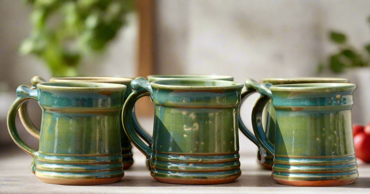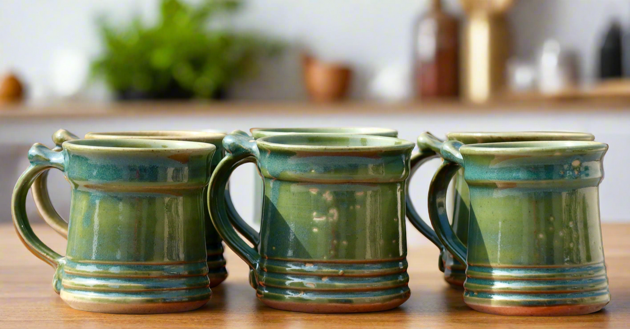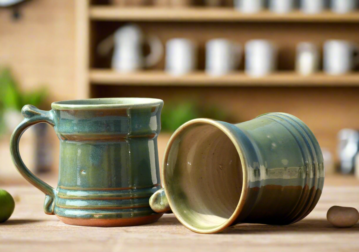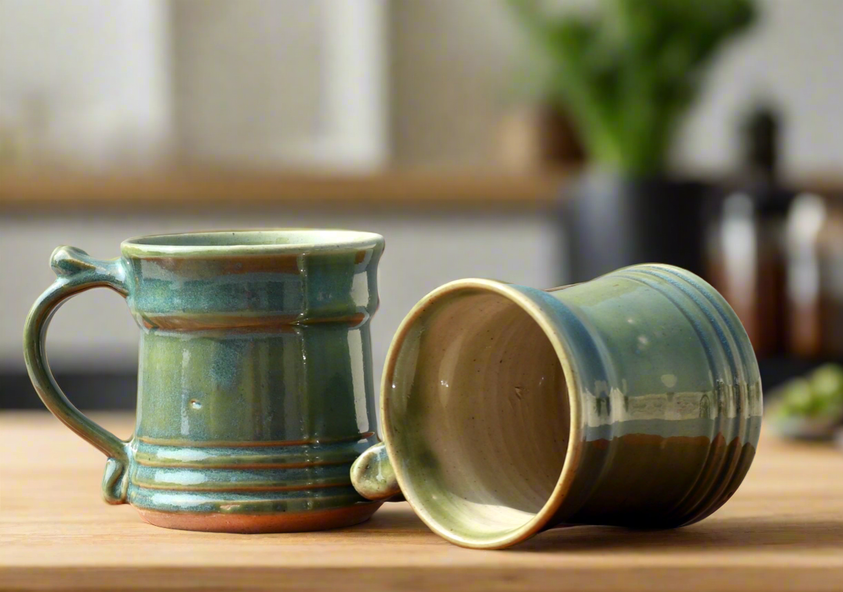 A pair of hand-thrown stoneware mugs can carry about 100 ML coffee or tea. The transparent glaze is unique because of uneven hues of green which were achieved during firing in a gas kiln. Since each work is handmade there will be a slight difference in the size and color but that is the uniqueness of the product. Microwave safe.