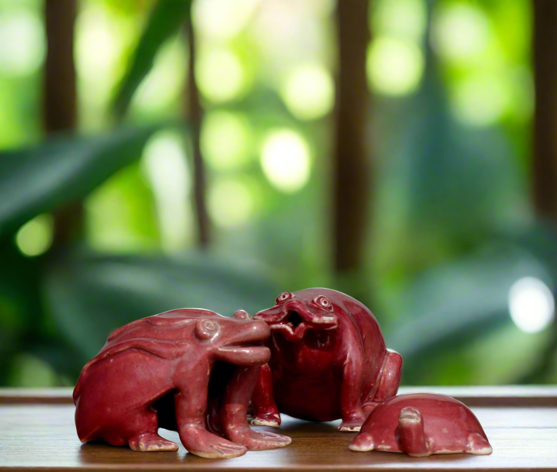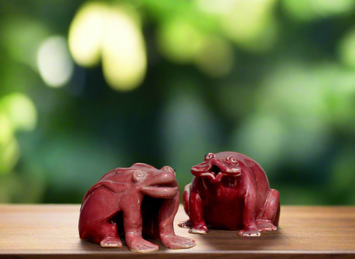 Continue shoppingA pair of hand-built frogs in red glaze can bring life to any quiet corner of your house. They are about 3-4 inches tall and 2-3 inches wide.