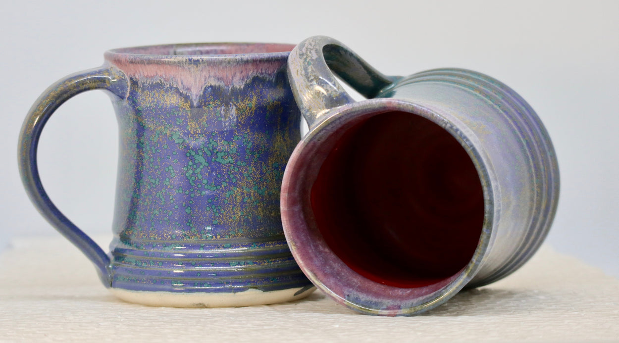 A pair of hand-thrown stoneware mugs can carry about 150 ML coffee or tea. The transparent glaze is unique because of uneven hues of blue which were achieved during firing in a gas kiln. Size and color might vary in the pair as they are handmade. Microwave safe.