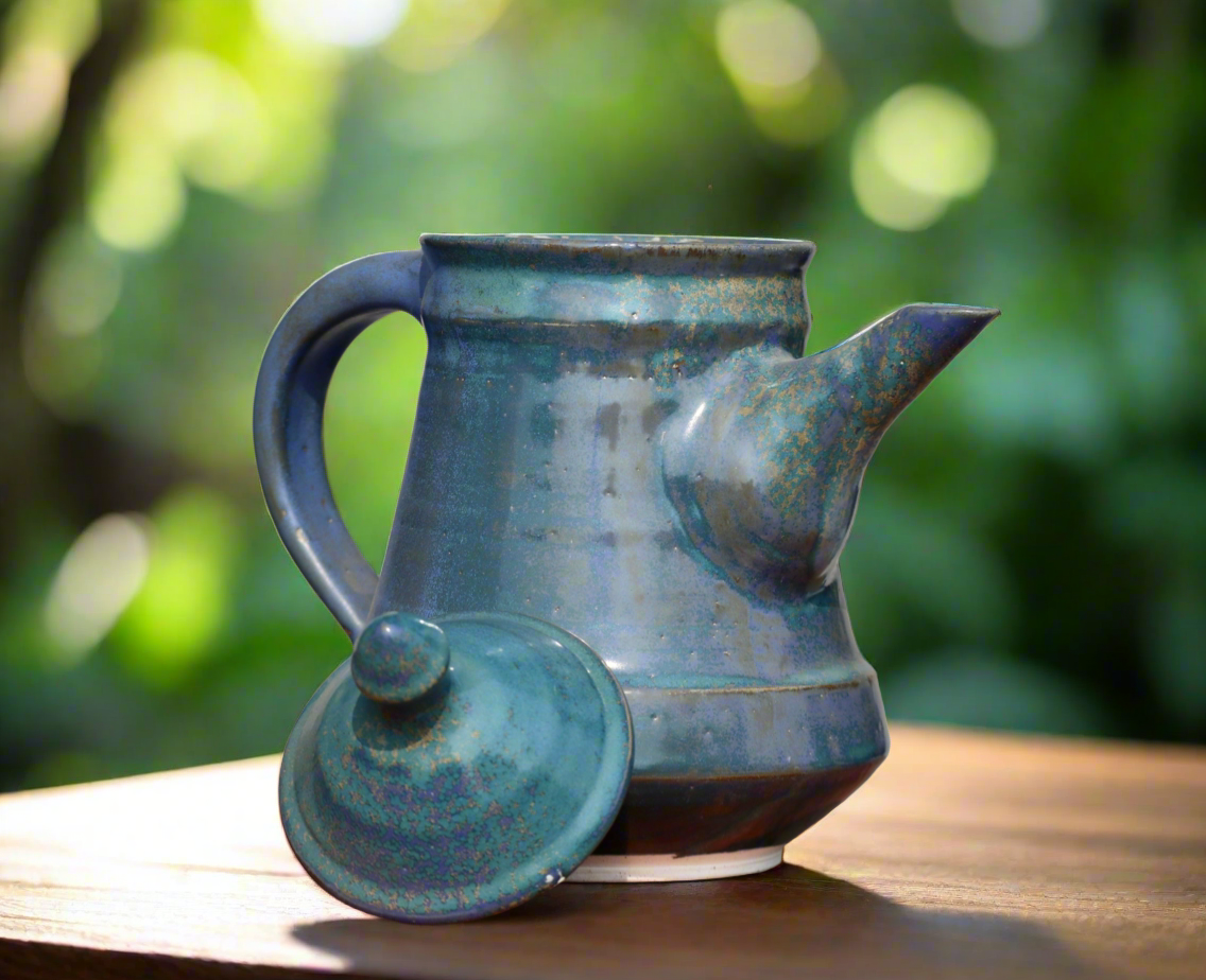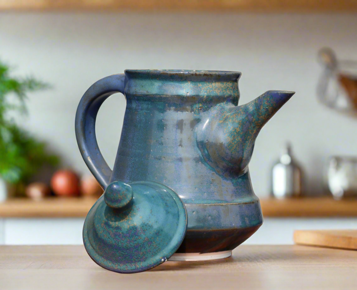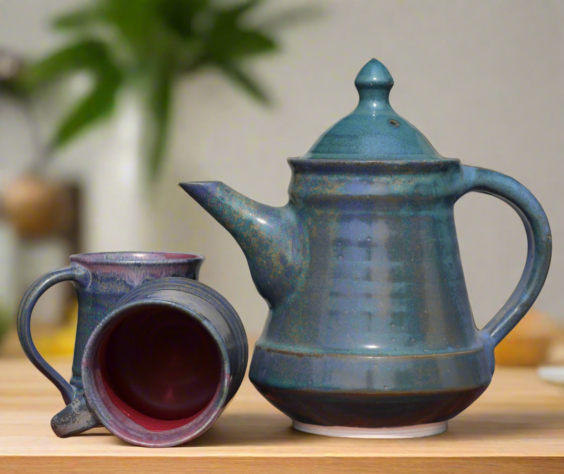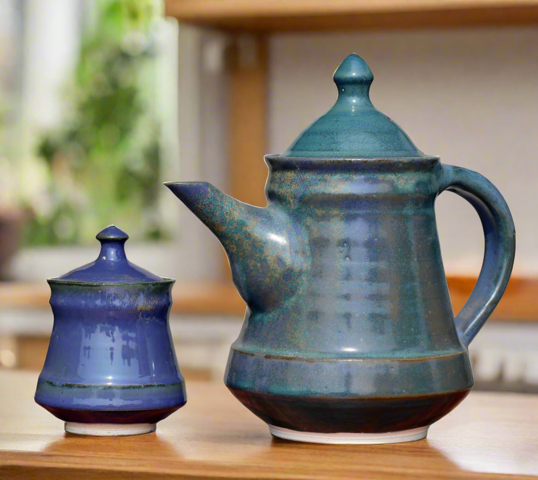 This king-size handmade teapot has been made on a pottery wheel in stoneware clay and fired in a gas kiln. It can hold upto 1 litre and is microwave safe. This can be coupled with similar Blue Magpie mugs and sugar pot separately.