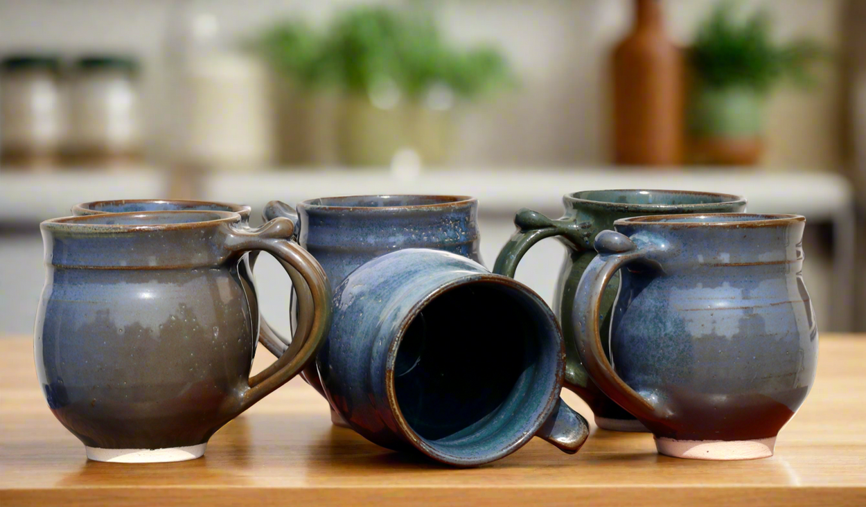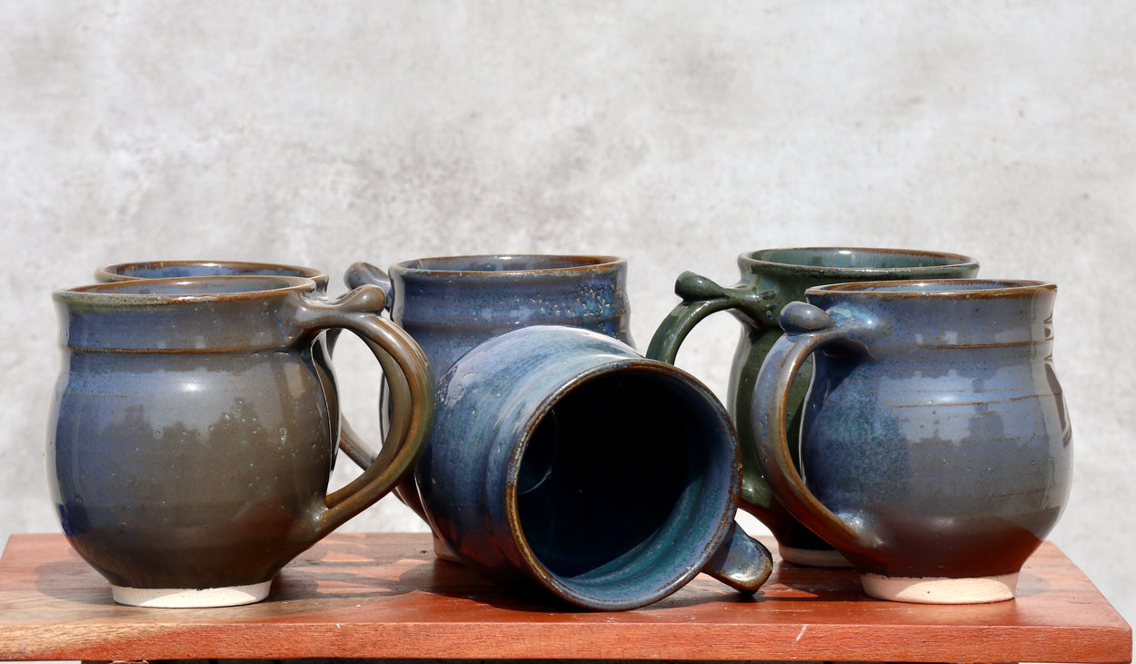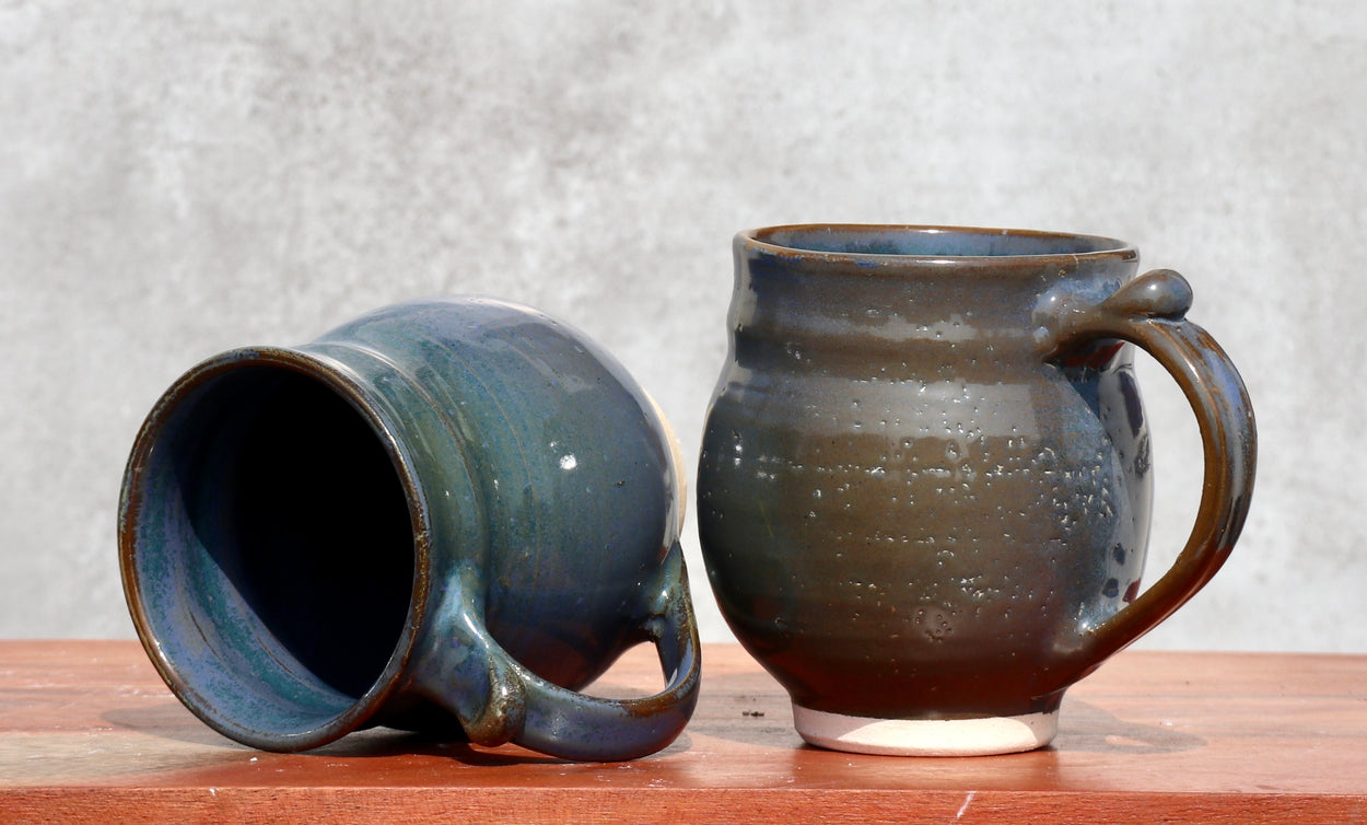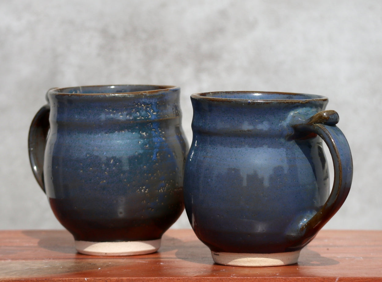 A pair of hand-thrown stoneware mugs can carry about 100 ML coffee or tea. The transparent glaze is unique because of uneven hues of blue which were achieved during firing in a gas kiln. Since each work is handmade there will be a slight difference in the size and color but that is the uniqueness of the product. Microwave safe.