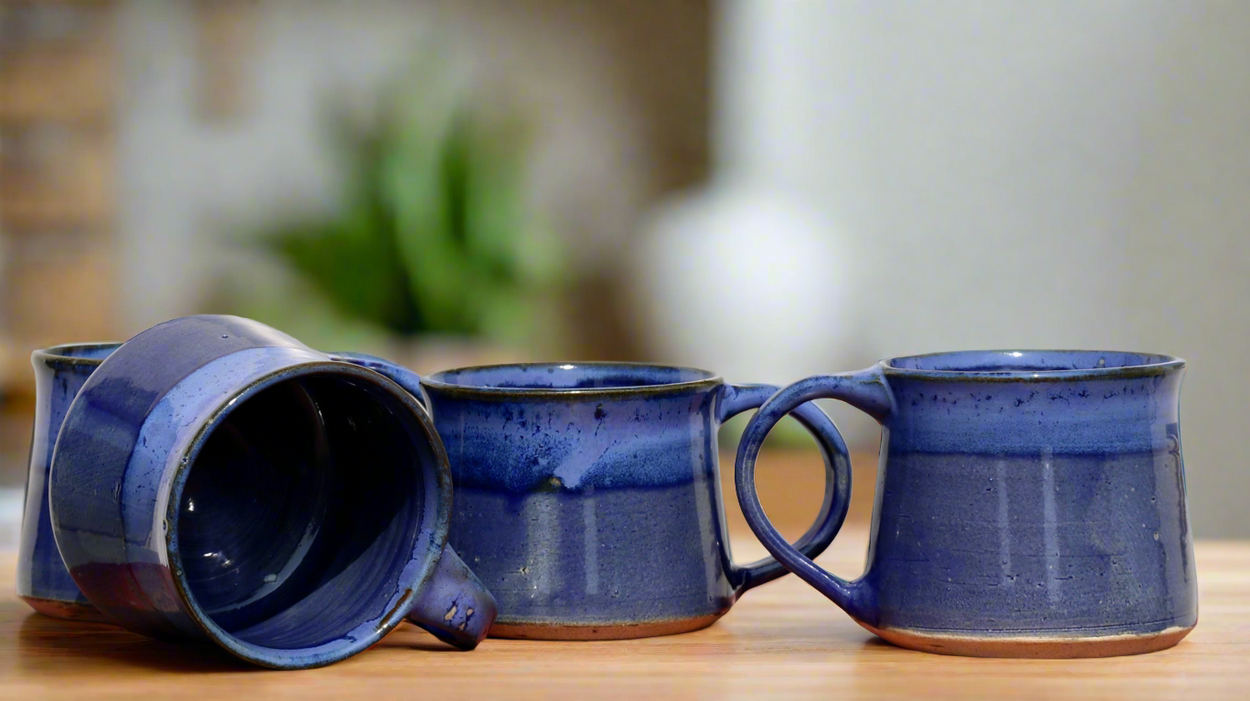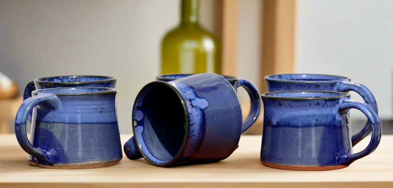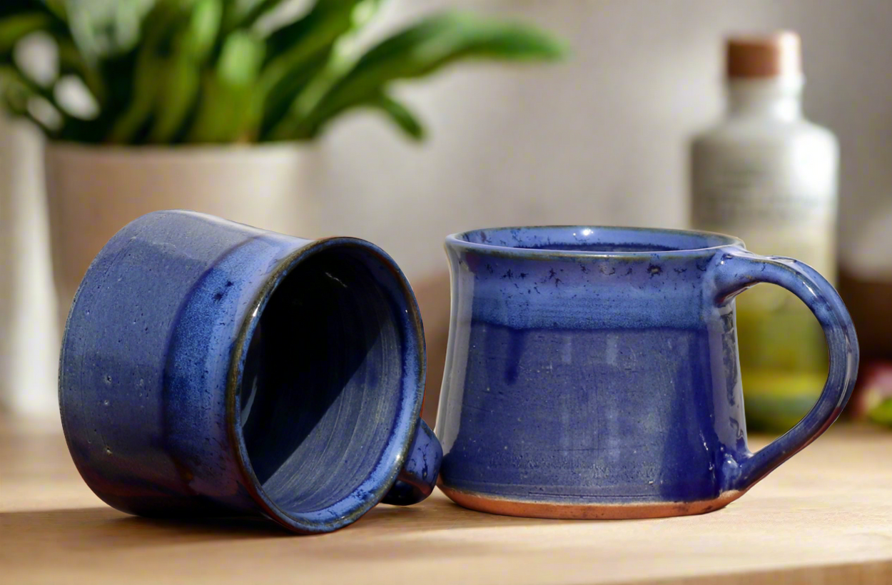 A pair of hand-thrown stoneware mugs can carry about 100 ML coffee or tea. The transparent glaze is unique because of uneven hues of blue which were achieved during firing in a gas kiln. Since each work is handmade there will be a slight difference in the size and color but that is the uniqueness of the product. Microwave safe.