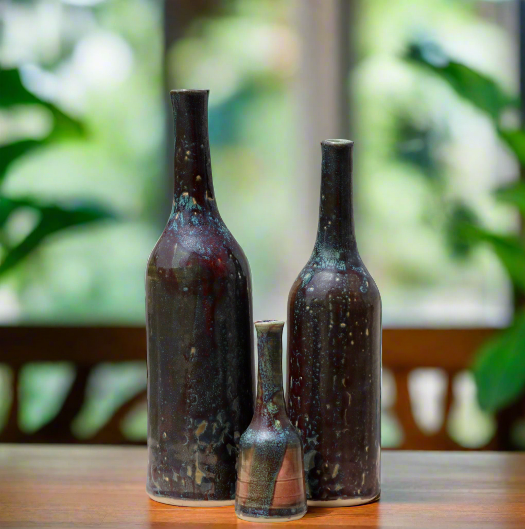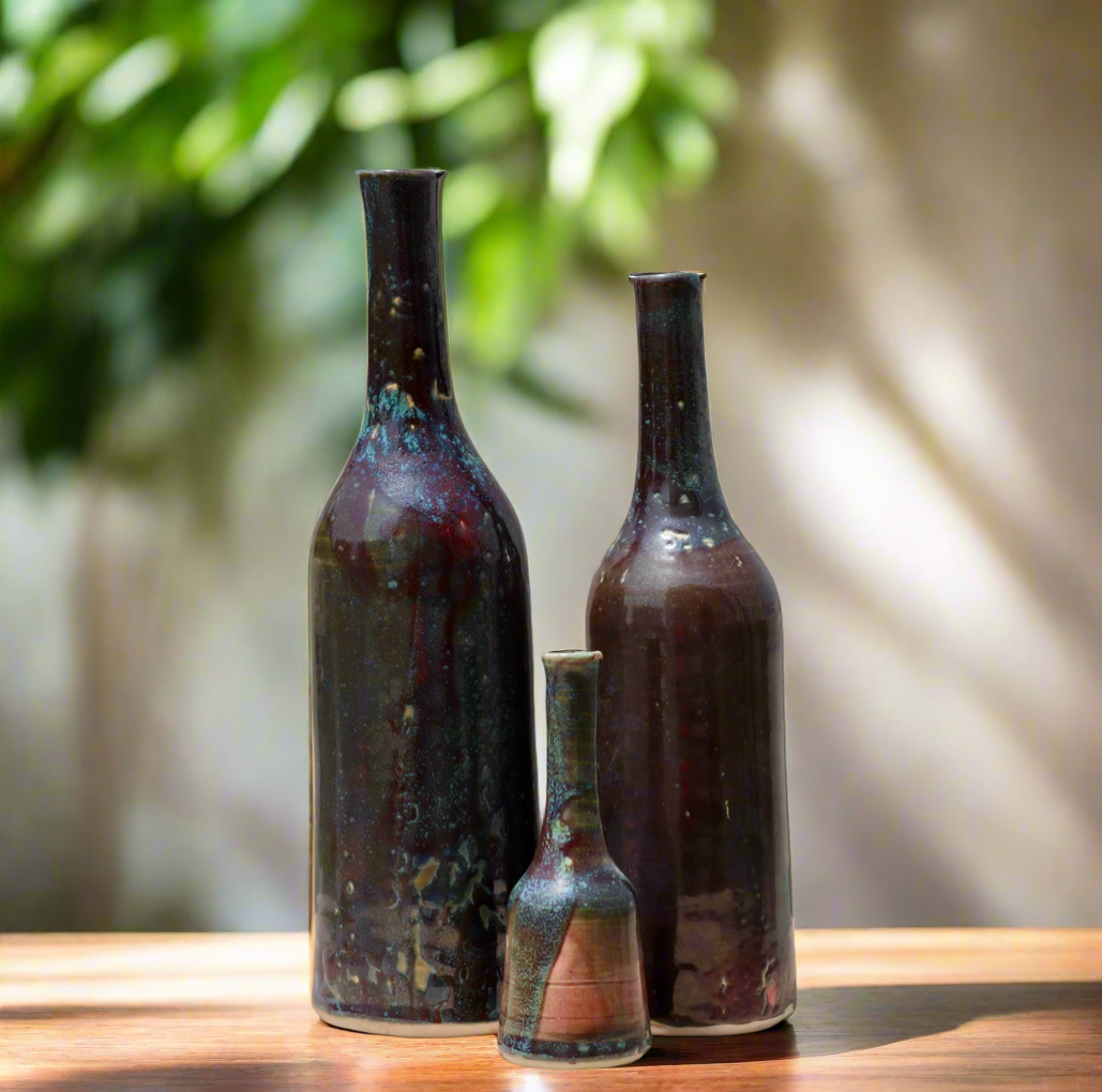 Group of three vases - two tall ones and a small one to enhance the game. These vases in stoneware clay fired in a gas kiln at 1260 degrees celsius. These vases have been thrown on a wheel and glazed in multiple glazes is ideal for holding fresh flowers. The height vary from 20 inches to 6 inches.