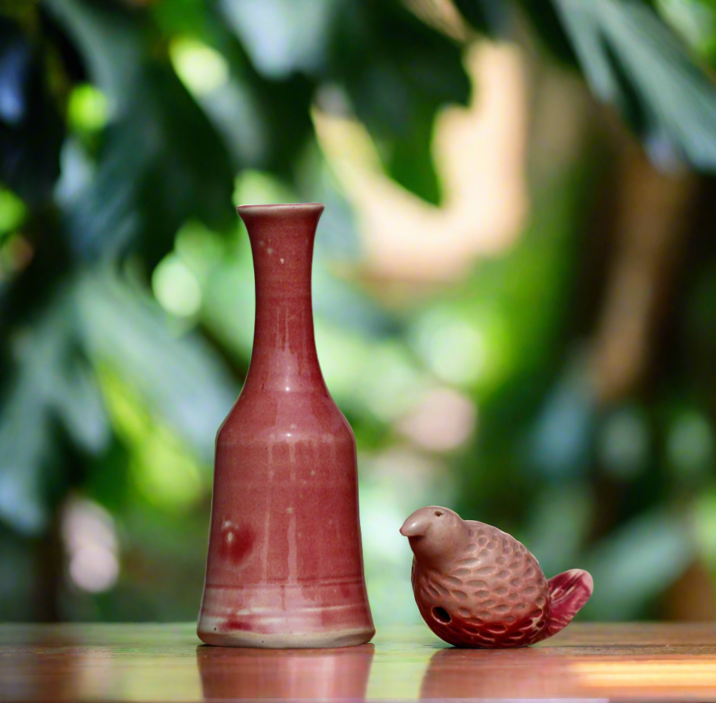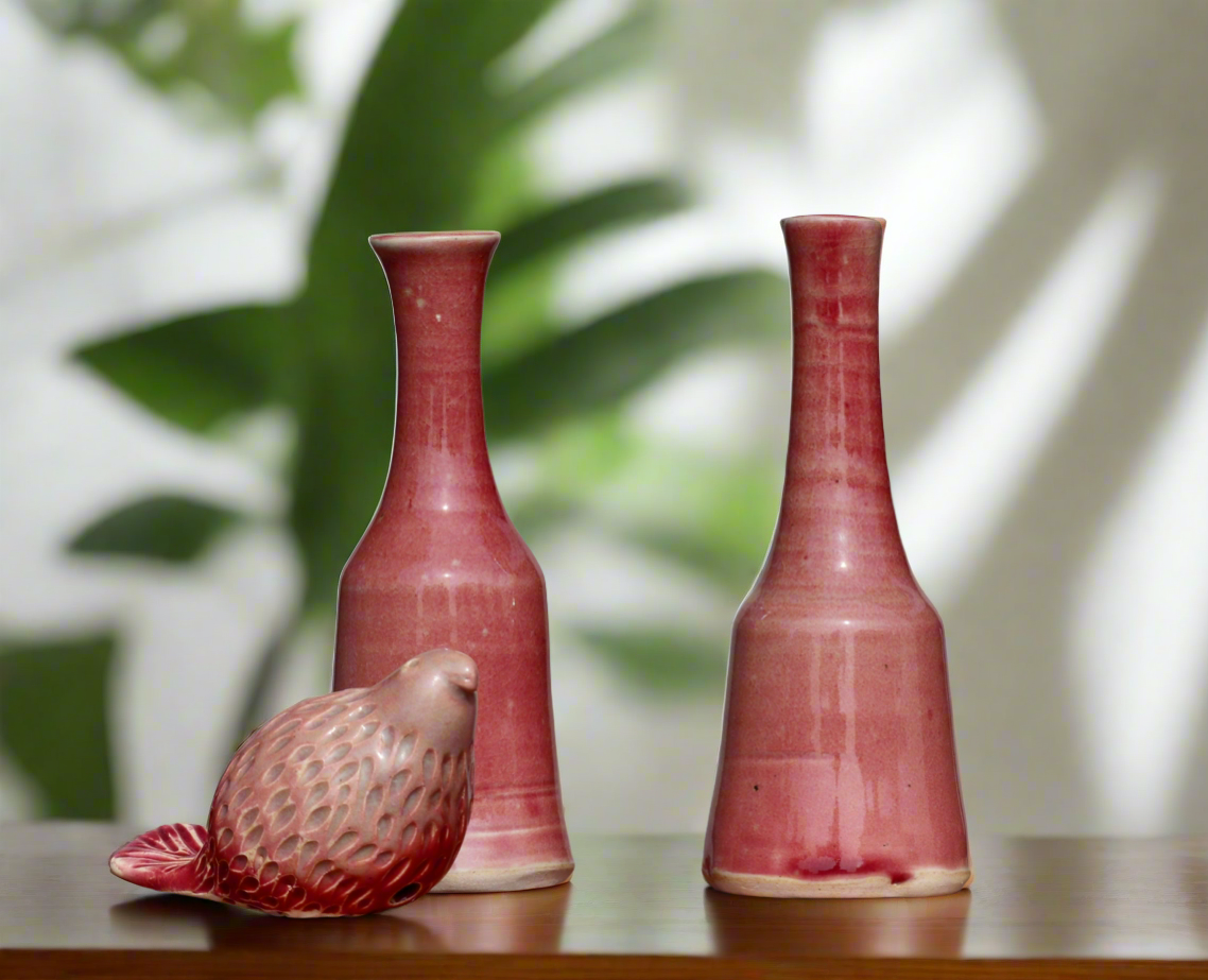 A set of two hand-built vases in stoneware clay have been fired in a gas kiln at 1260 degrees celsius. The 8-inch tall vases can sit happily on a coffee table with some fresh daisies to bright up the space. Since they are handmade, the size and color might slightly vary.