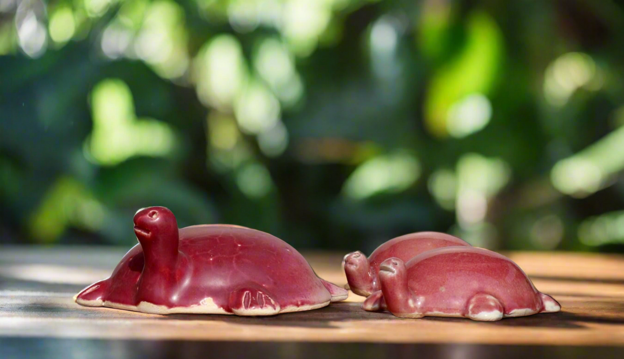 A set of three little hand-built tortoise in stoneware clay reminds you of resilience. Each is about 2-3 inches wide and 2 inches tall.