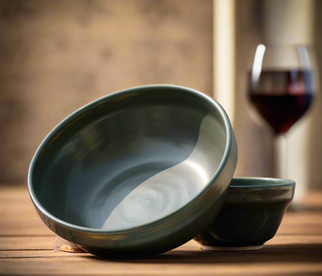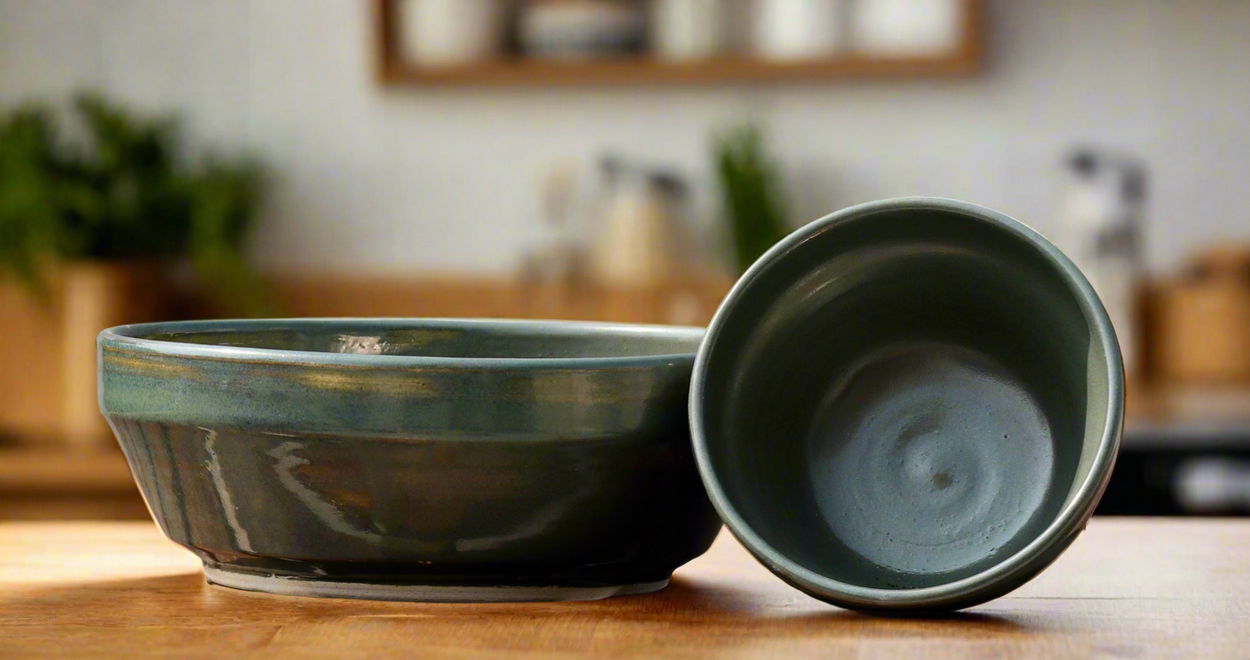 Set of two bowls in stoneware clay - handmade on a wheel and fired in a gas kiln at 1260 degrees celsius. The big bowl can hold upto a litre and the other one can hold about 250 ML. Microwave safe. Since each work is handmade and built on pottery wheel, the sizes and shapes might vary slightly but that is the uniqueness of the product.