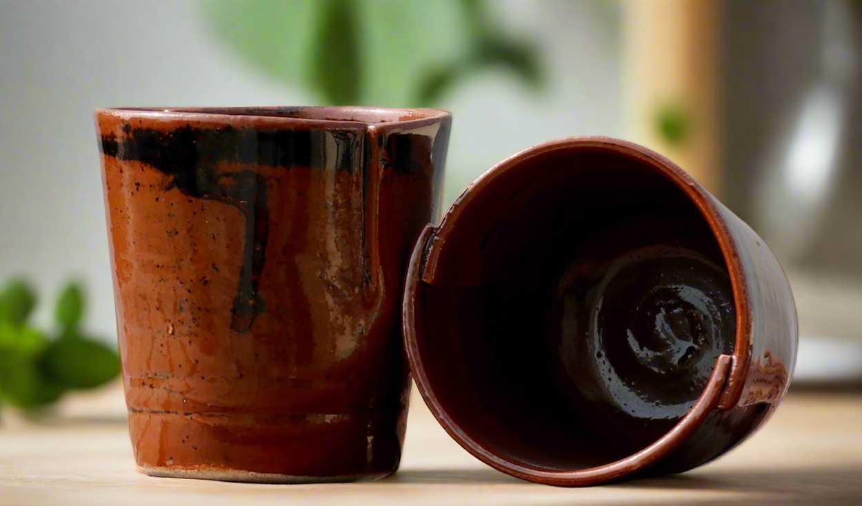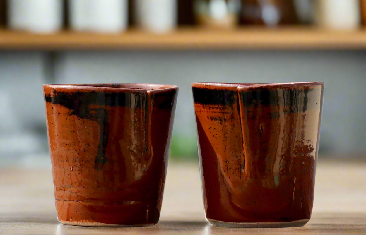A pair of three hand-thrown stoneware mugs can carry about 100 ML coffee or tea. This unevenness is the uniqueness about each work. The uneven hues of red were achieved during firing in a gas kiln. Since each work is handmade there will be a slight difference in the size and color. Microwave safe.