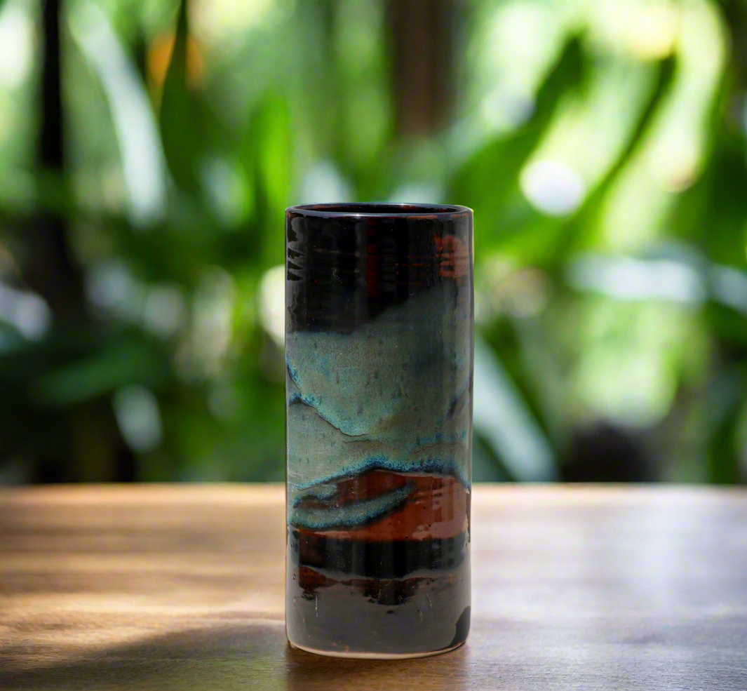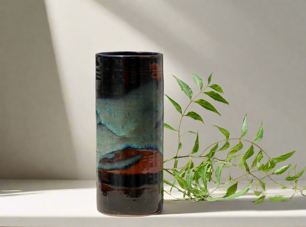 Tall vase in stoneware clay fired in a gas kiln at 1260 degrees celsius. This 20 inch vase has been thrown on wheel and glazed in multiple glazes is ideal for holding fresh flowers from the garden.