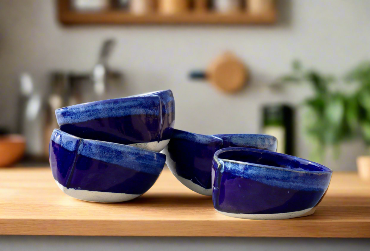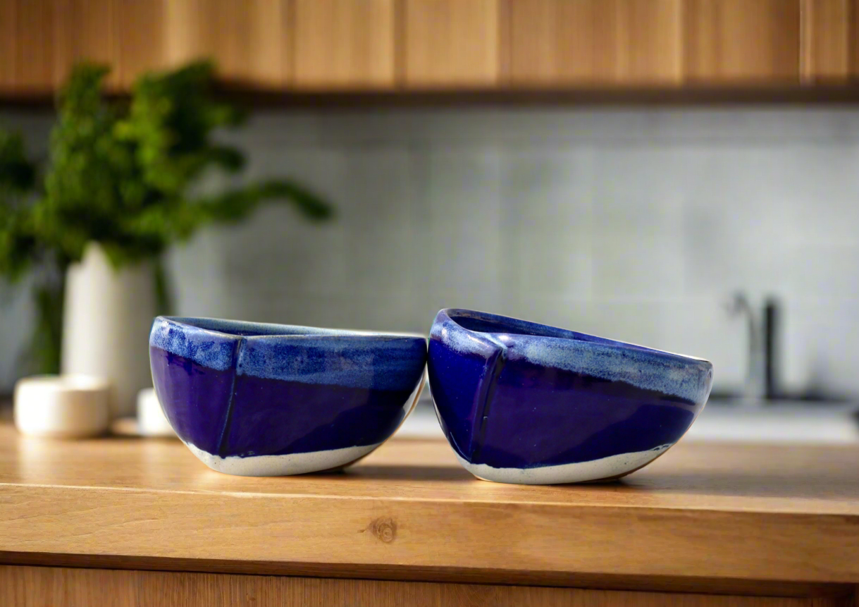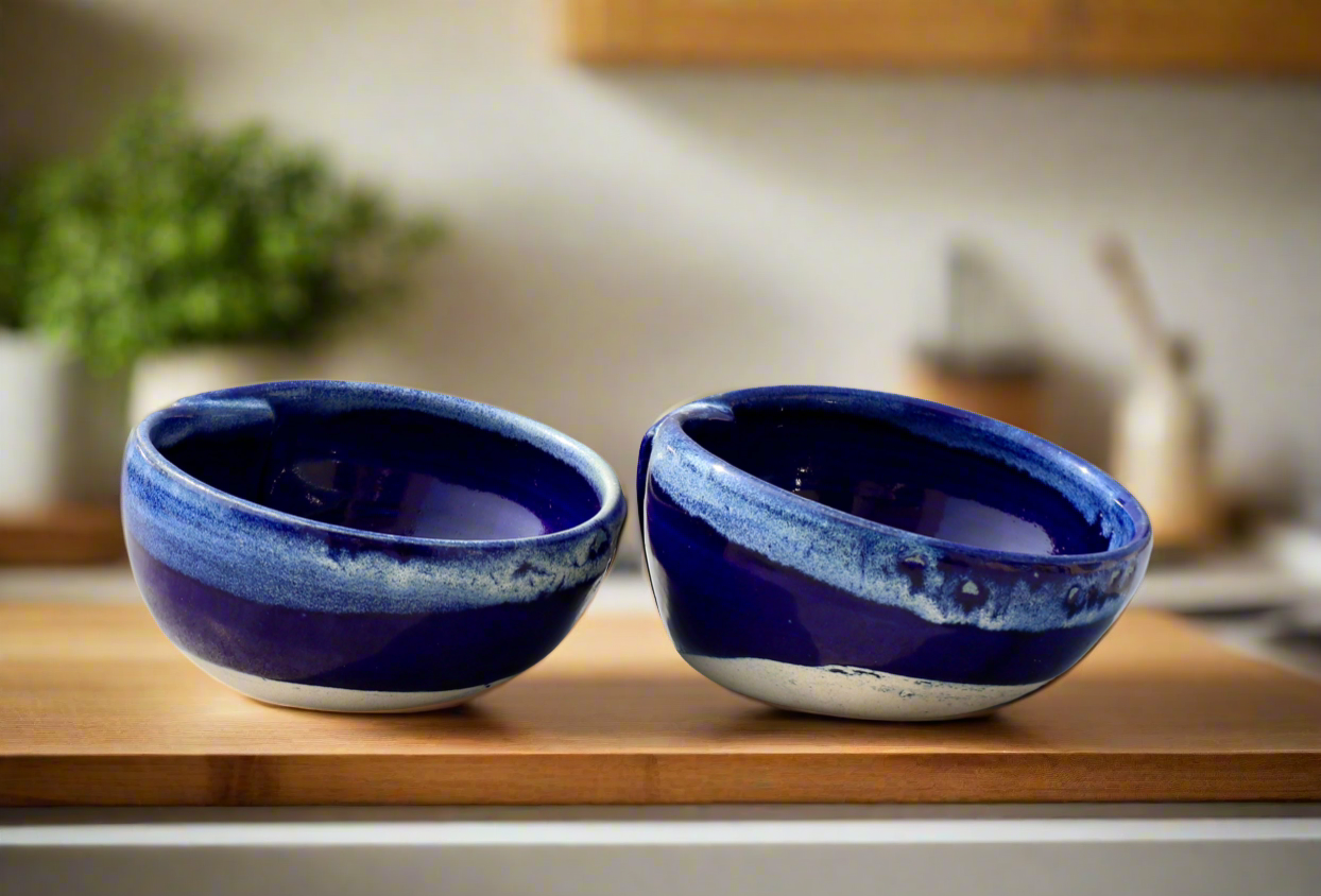 Set of two bowls in stoneware clay - handmade on a wheel and fired in a gas kiln at 1240 degrees celsius. Each bowl can hold about 200 ML. Microwave safe.